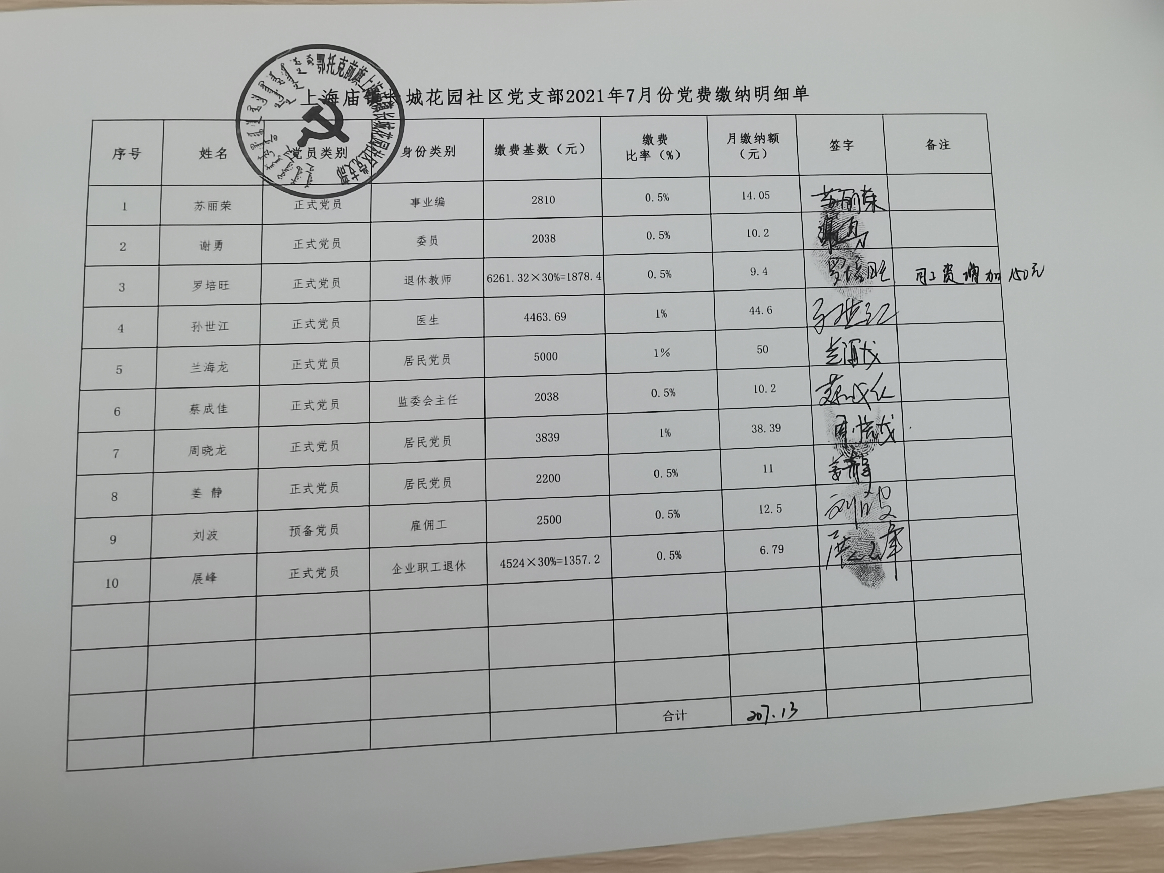 长城花园社区党支部7月份党费缴纳明细