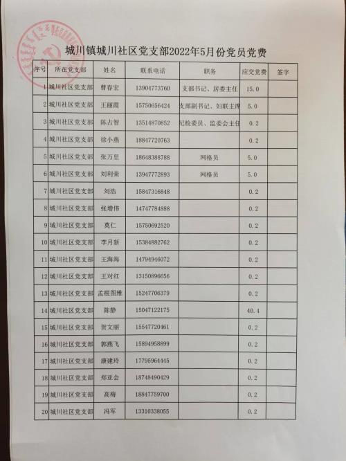 城川社区2022年5月份党费公开
