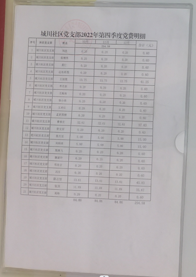 城川社区2022年第四季度党费公示