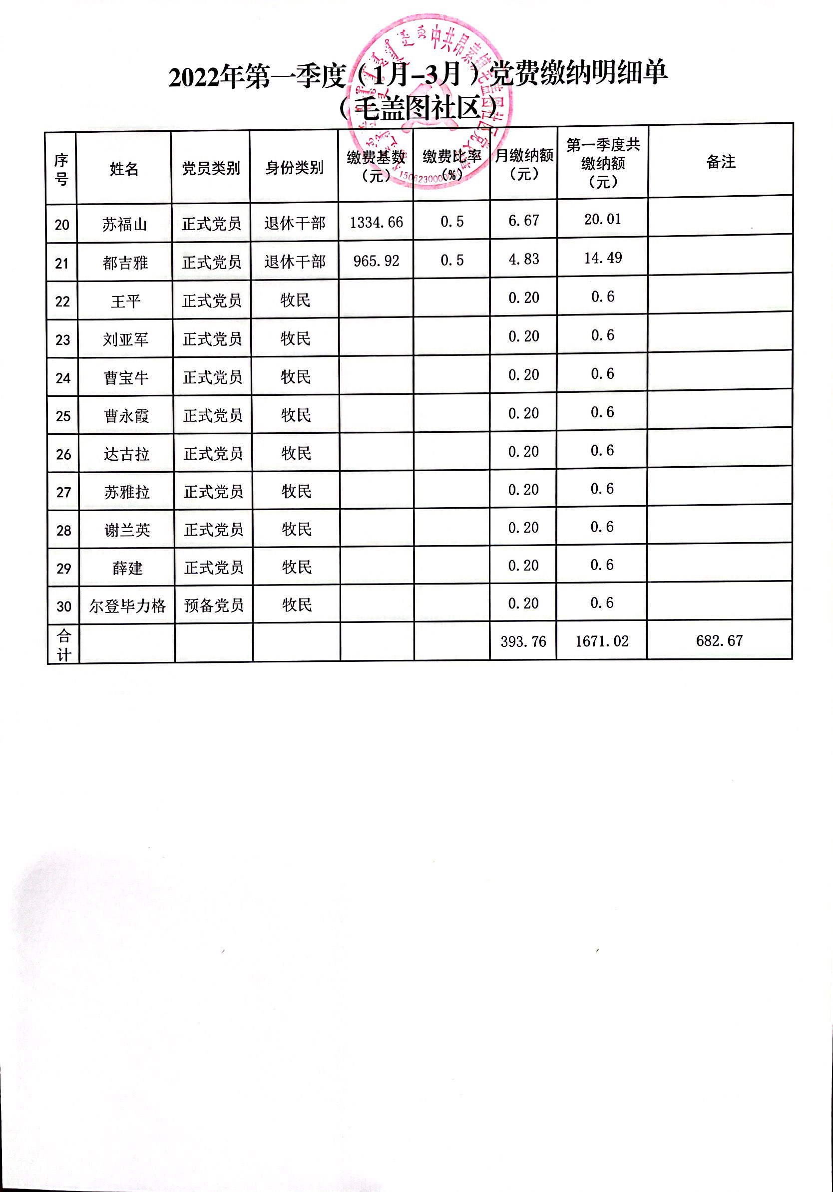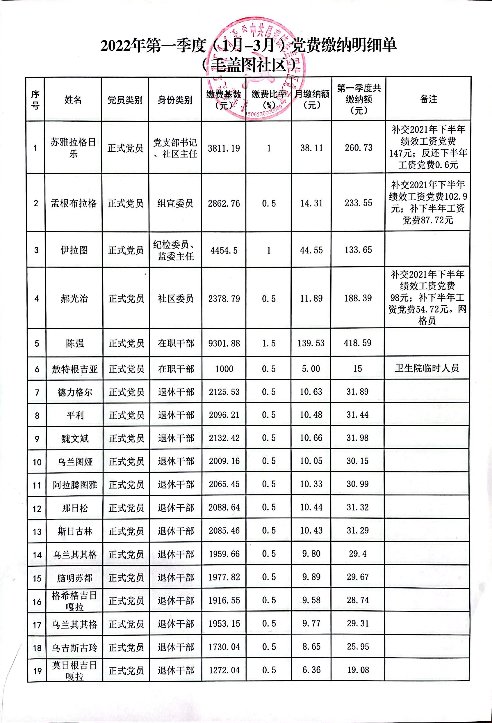 毛盖图社区党支部2022年第一季度党费