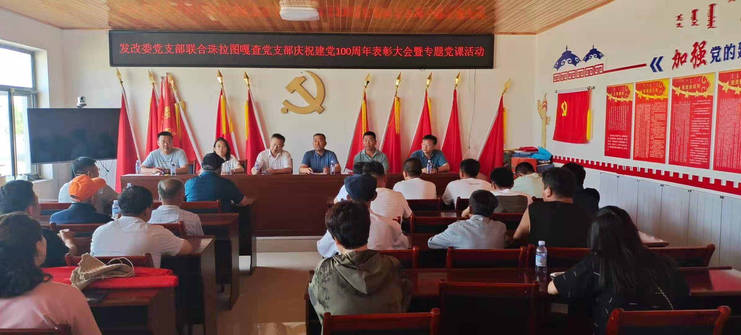 2021年6月25日发改委党支部联合珠拉图嘎查党支部庆祝建党100周年表彰大会暨专题活动上第一书记郭勇源主持会议,会议上发改委党支部,珠拉图嘎查三委和网格员,部分党员以及群众参会。